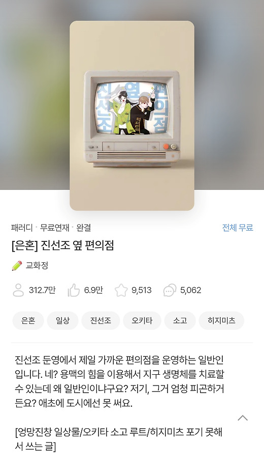 2021. 08. 14. [ 진선조 옆 편의점 ] 집필 시작 2021. 10. 11. '너를 좋아해' 업로드 2021. 12. 03. 1차 휴재 2022. 01. 21. 재연재 2022. 06. 15. 2차 휴재 2022. 09. 08. 재연재 2022. 10. 11. 최종화 '작별' 업로드 2022. 11. 14. 외전 업로드 2023. 04. 01. 소장본 수요 조사 2023. 10. 20. 소장본 배송 완료 2023. 12. 31. 습작 2024. 10. 11. ~ 2025. 01. 11. 1차 습작 해제 2025. 10. 11. ~ 2026. 01. 11. 2차 습작 해제 현재 트위터에서 활동 중